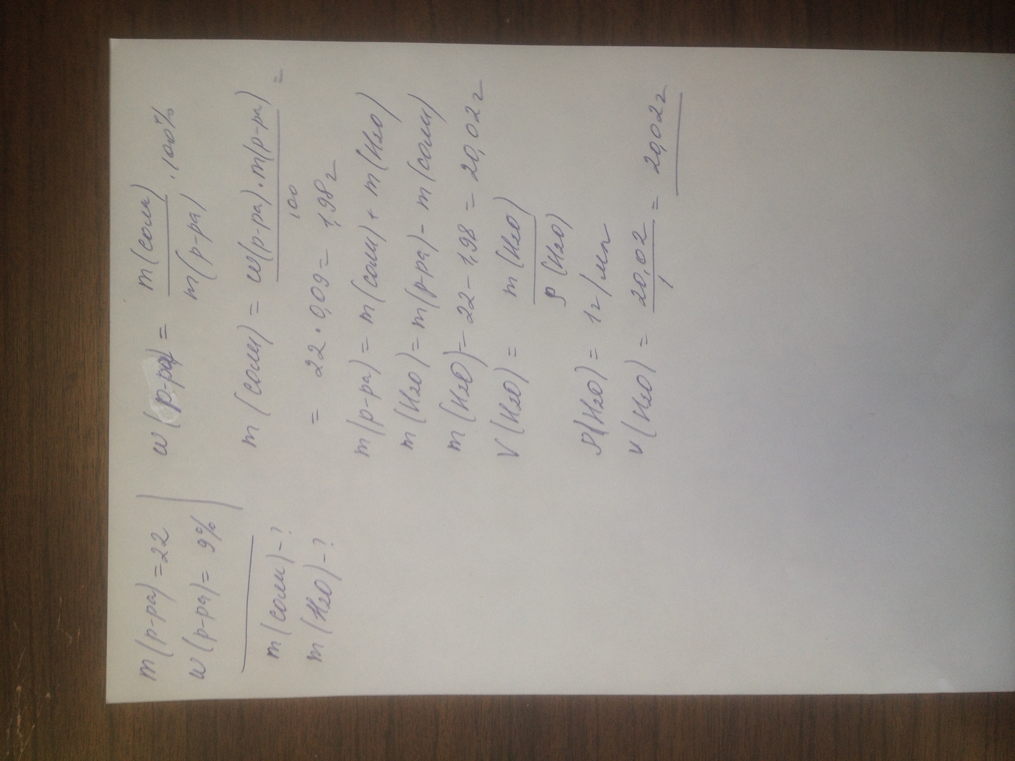 Рассчитать массу соли и объём воды,необходимые для приготовления раствора 22г 9%-го раствора
