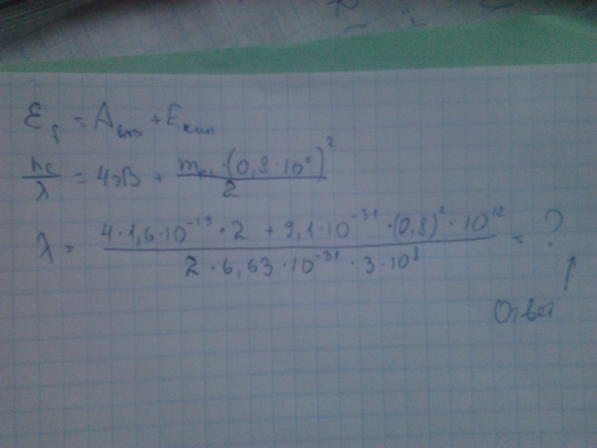 какой длины электромагнитную волну следует направить на поверхность цинка, чтобы скорость электрона, вылетевшего из металла, была 0,8*10^6? работа выхода электронов из цинка равна 4 эВ