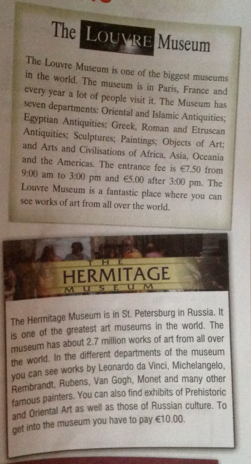 1. Музей Лувр является одним из крупнейших музеев в мире. Музей находится в Париже, Франция, и каждый год много людей посещают его. Музей имеет семь Кафедра: восточные и исламских древностей; Египетских древностей; Греческих, римских и этрусских древностей; Скульптуры; Картины; Объекты искусства; и искусств и цивилизаций Африки, Азии, Океании и Америки. Вступительный взнос составляет 7,50 с 9:00 утра до 3:00 вечера и 5.00 после 3:00 вечера. Музей Лувр это фантастическое место, где можно увидеть произведения искусства со всего мира.