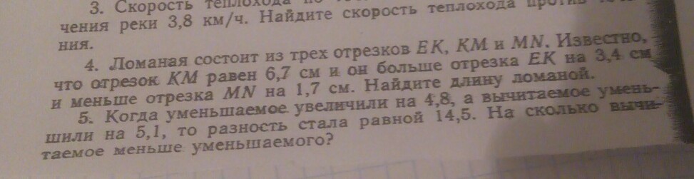 Длина ломаной: КМ+ЕК+МN=6,7+3,3+8,4=18,4 см.