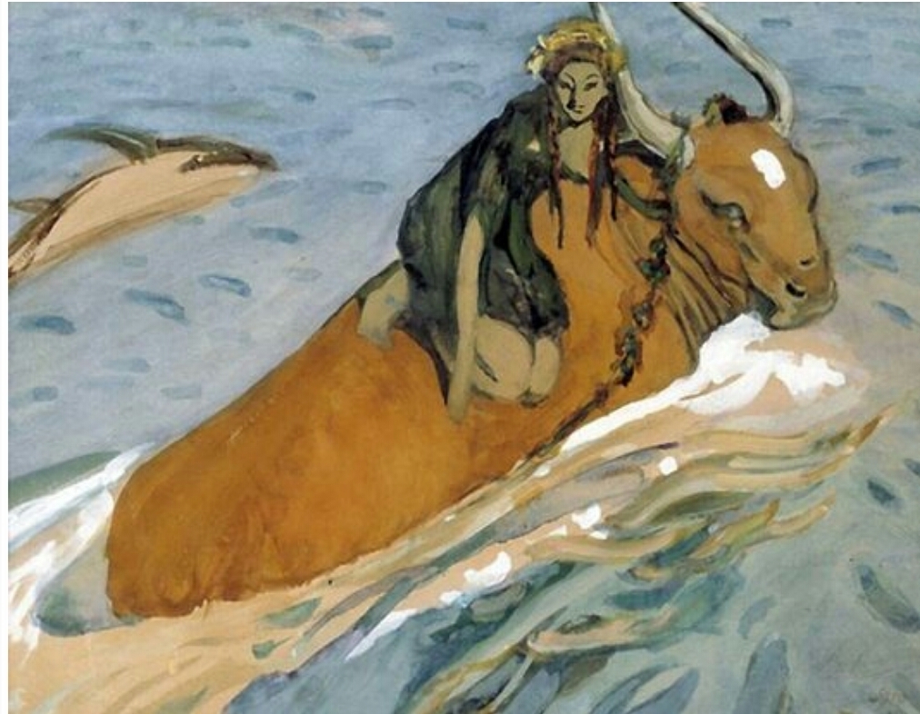 На этой картине изображена девушка, сидящая на быке, который плывёт по морю. Видно, что она убегает от кого-то, так как её взгляд насторожен и как будто смотрит на кого-то. Может, они от кого то спаслись, так как я заметил(а) цепь на быке. Я решил(а) что это море, потому, что на заднем плане изображён дельфин. Можно эту картину назвать "Побег" по моему мнению.