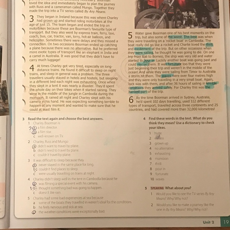 They began in Ireland because this was where Charley had grown up and started riding motorbikes at the age of just 15. The team began and ended the trip on motorbikes because these are Boorman 's favourite type of transport . But they also went by express train , ferry , taxi , coach , bus , car , tractor , van , lorry , hot - air balloon , and helicopter . Sometimes there were delays and they missed a connection . On two occasions Boorman ended up catching a plane because there was no - alternative . But he preferred more exotic types of transport like anelephant in India and a camel in Australia . It was good that they did n't have to carry much luggage !