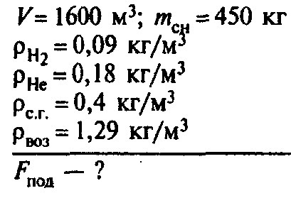 Масса снаряжения воздушного шара (оболочки, сетки, корзины) составляет 450 кг. Объем шара 1600 м3. Вычислите, какой подъемной силой будет обладать этот шар при наполнении его водородом, гелием, светильным газом. (Плотность светильного газа 0,4 кг/м3.)