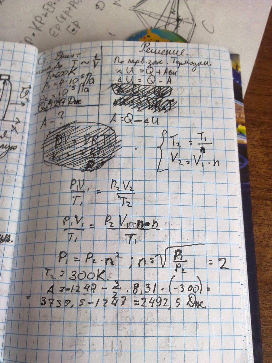 один моль аргона, находящийся в цилиндре при температуре Т1=600К и давлении р1=4* 10^5 Па, расширяется и одновременно охлаждается так, что его температура при расширении обратно пропорциональна объему. Конечное давление газа р2=10^5 Па. Какую работу совершил газ при расширении, если он отдал холодильнику количество теплоты Q=1247 Дж?
