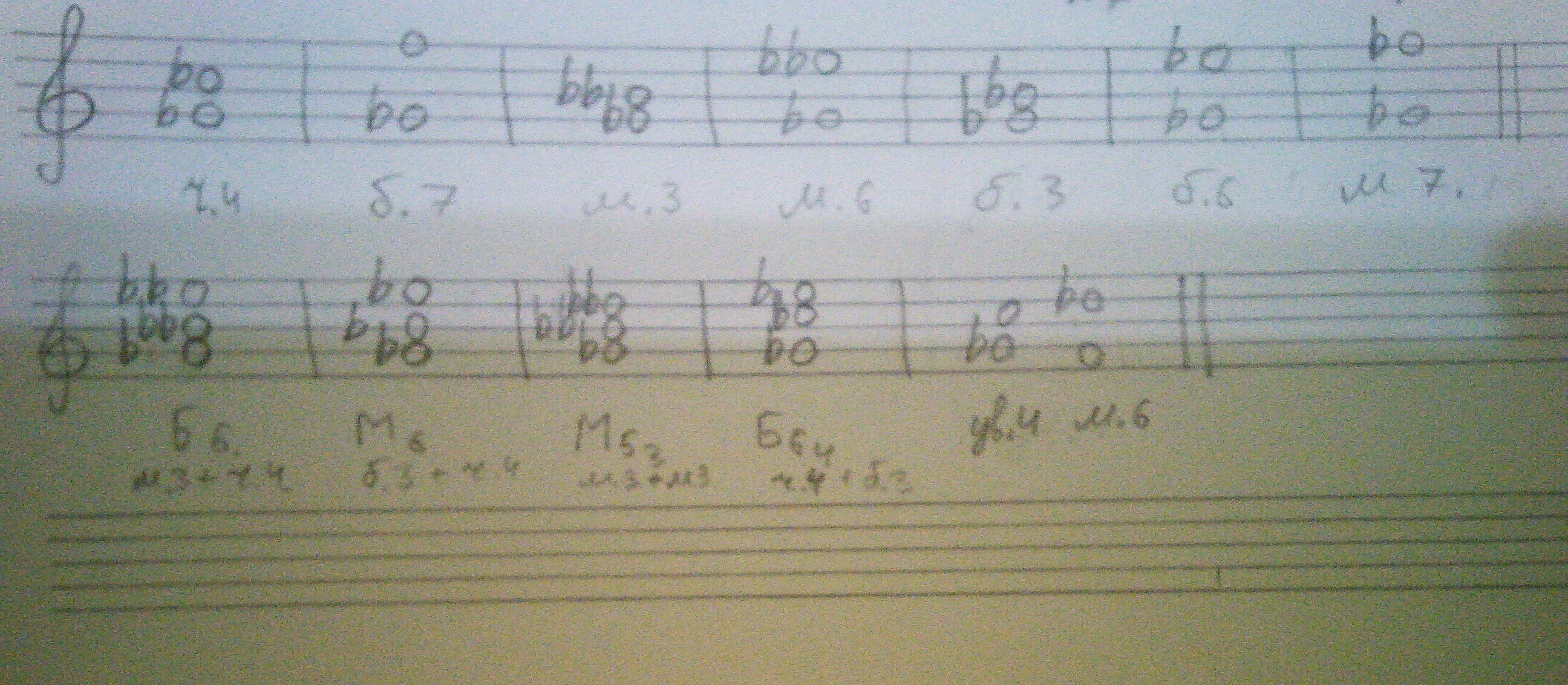 помогите постройте интервалы :ч4 , б7 , м3 , м6 , ув4 , Б6 , М6 в верх от соль бемоль . б3 , б6 , м7 М35 ,Б46 М6