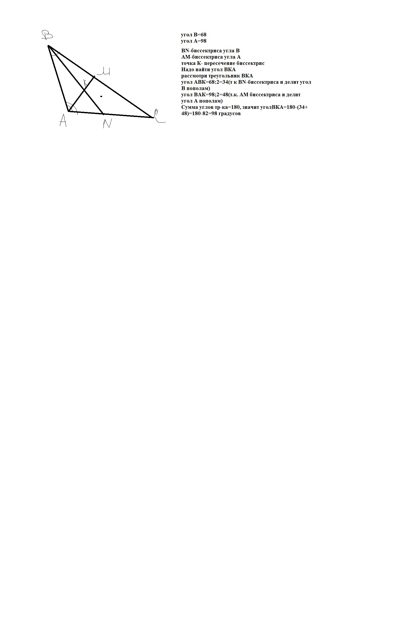 Два угла треугольника равны 68 и 98 градусов. Найдите градусную меру угла, образованного биссектрисами этих углов.