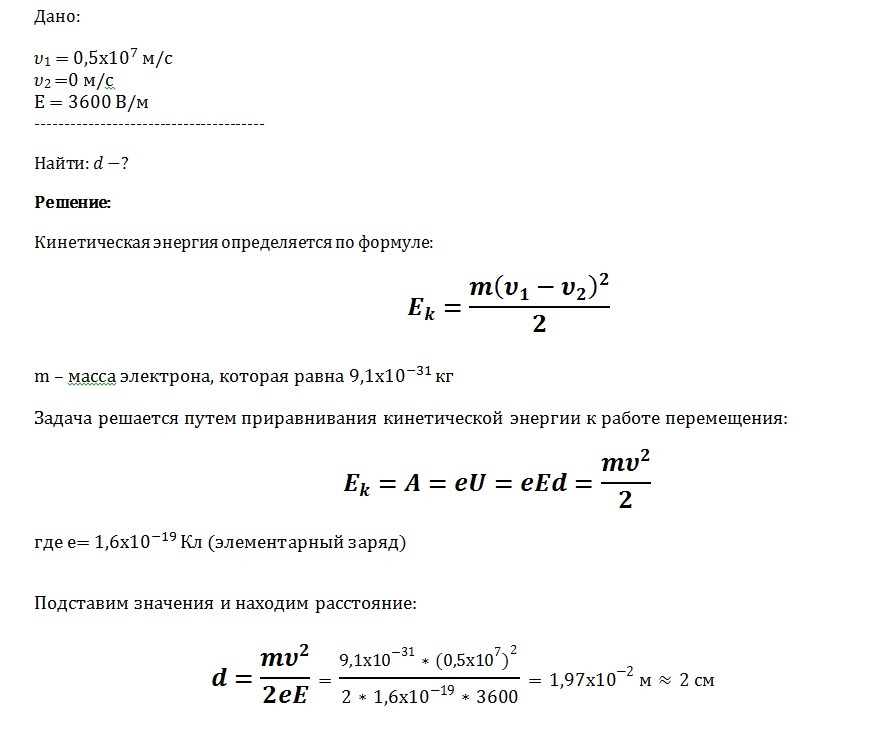 В однородное электрическое поле со скоростью 0.5*10^7 м/с влетает электрон и движется по направлению линий напряжённости поля. Какое расстояние пролетит электрон до полной потери скорости, если модуль напряжённости поля равен 3600 В/м