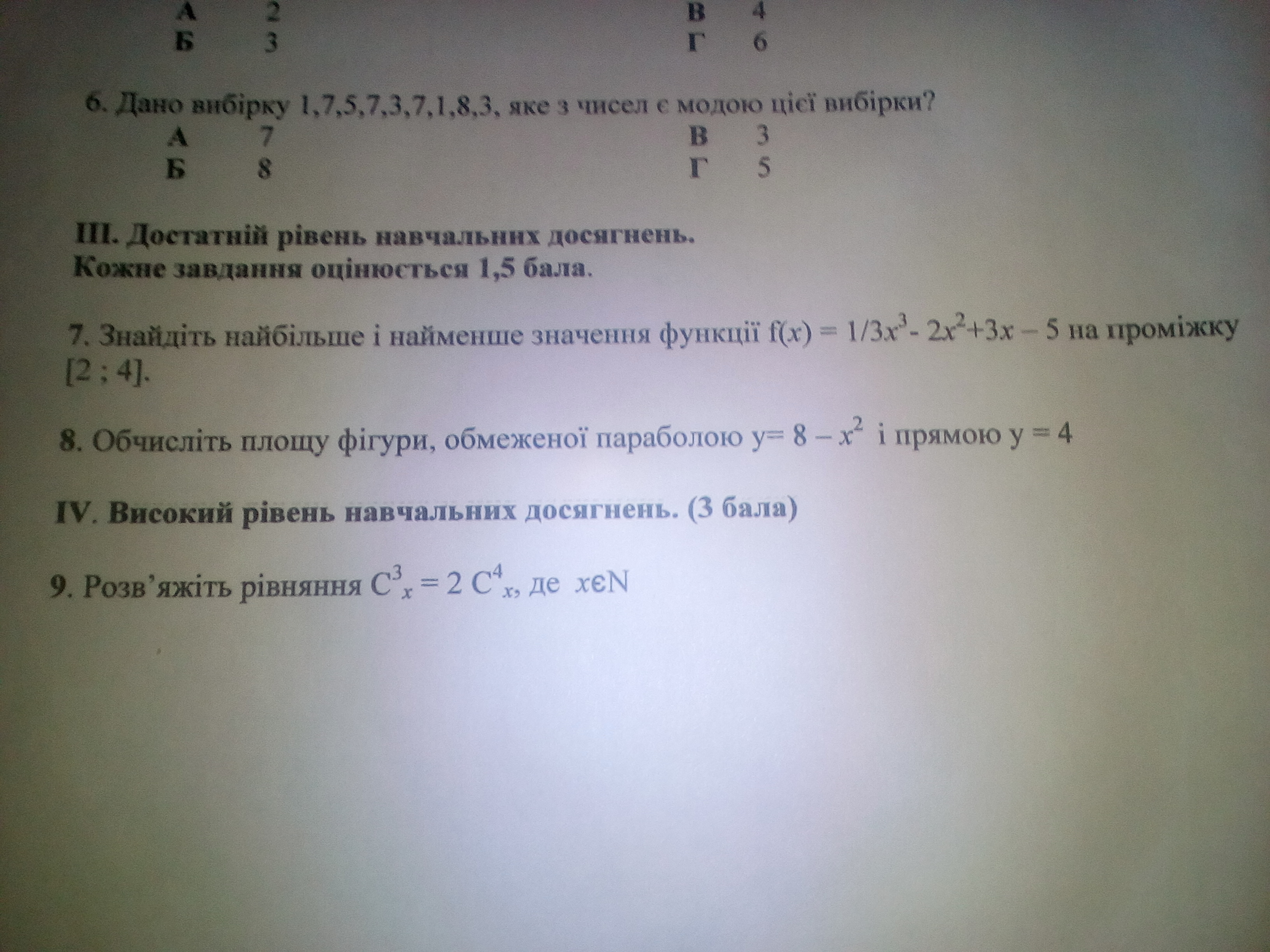7); ; ; y= frac{1}{3} x^3-2x^2+3x-5; ,; ; ; xin [, 2;4, ]\\y'=x^2-4x+3=0; ; to ; ; x_1=1; ,; ; x_2=3; ; (teor.; Vieta)\\x_1=1notin [, 2;4, ]\\y(3)= frac{1}{3} cdot 3^3-2cdot 3^2+3cdot 3-5=-5\\y(2)=frac{8}{3}-8+6-5=frac{8}{3}-7=-frac{13}{3}=-4frac{1}{3}\\y(4)= frac{64}{3} -32+12-5= frac{64}{3} -25=- frac{11}{3}=-3 frac{2}{3}  \\y_{naibol.}=y(4)=-3frac{2}{3}\\y_{naimen.}=y(3)=-5
