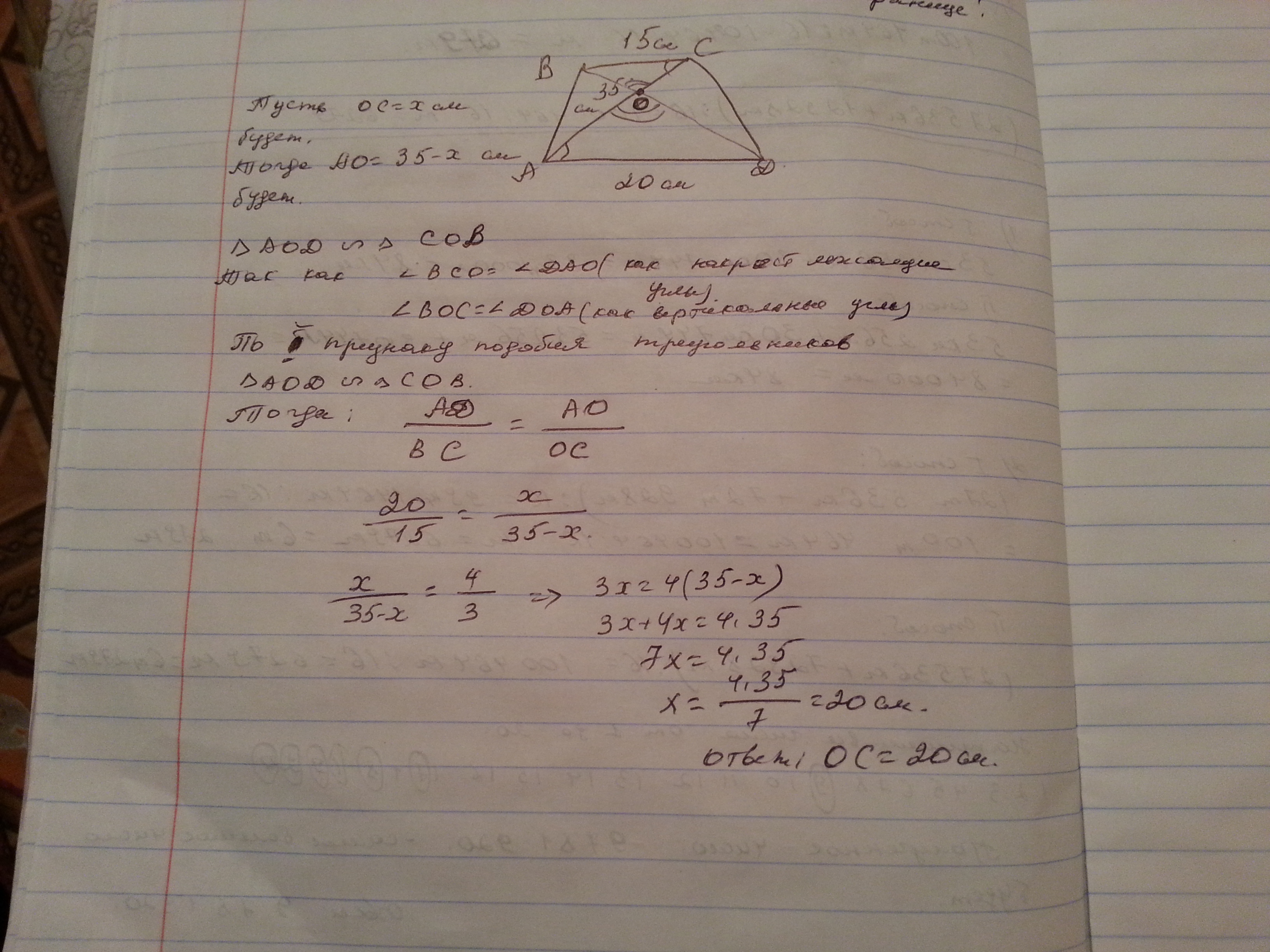 Ребяят,помогите даю 40 БАЛЛОВ!!(Знаю много,но я хочу удостовериться в ответе).В трапеции ABCD основание AD=20 см,BC=15. Диагональ AC= 35 см.О-точка пересечения диагоналей. Определите OC??