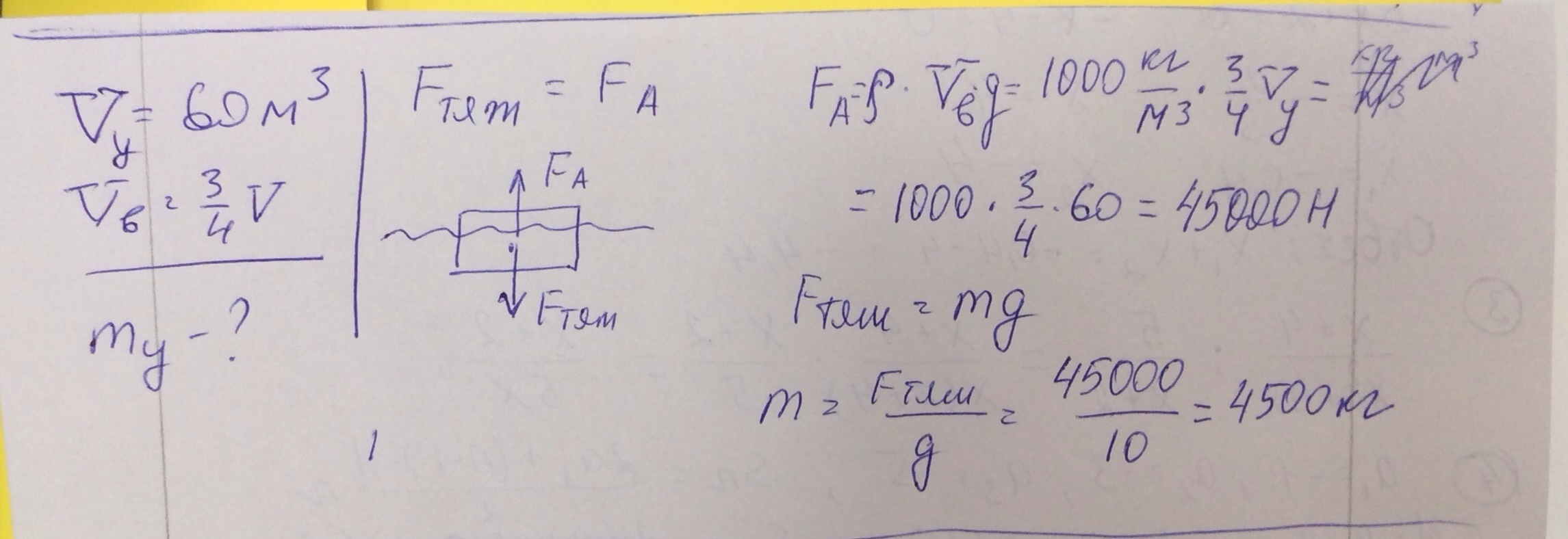 Объем тела владыки морей Ульмо составляет 60 м³. Найдите массу тела Ульмо, если он может плавать в море, погрузившись под воду на три четверти объема.