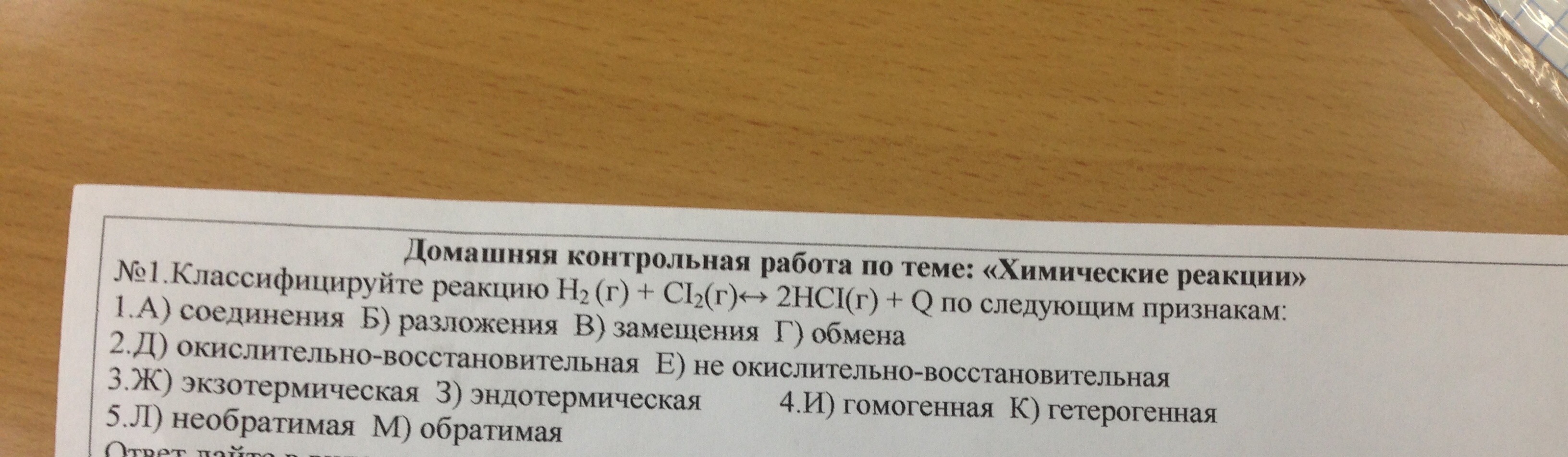 соединения, ОВР, Экзотермическая, гомогенная,обратимая