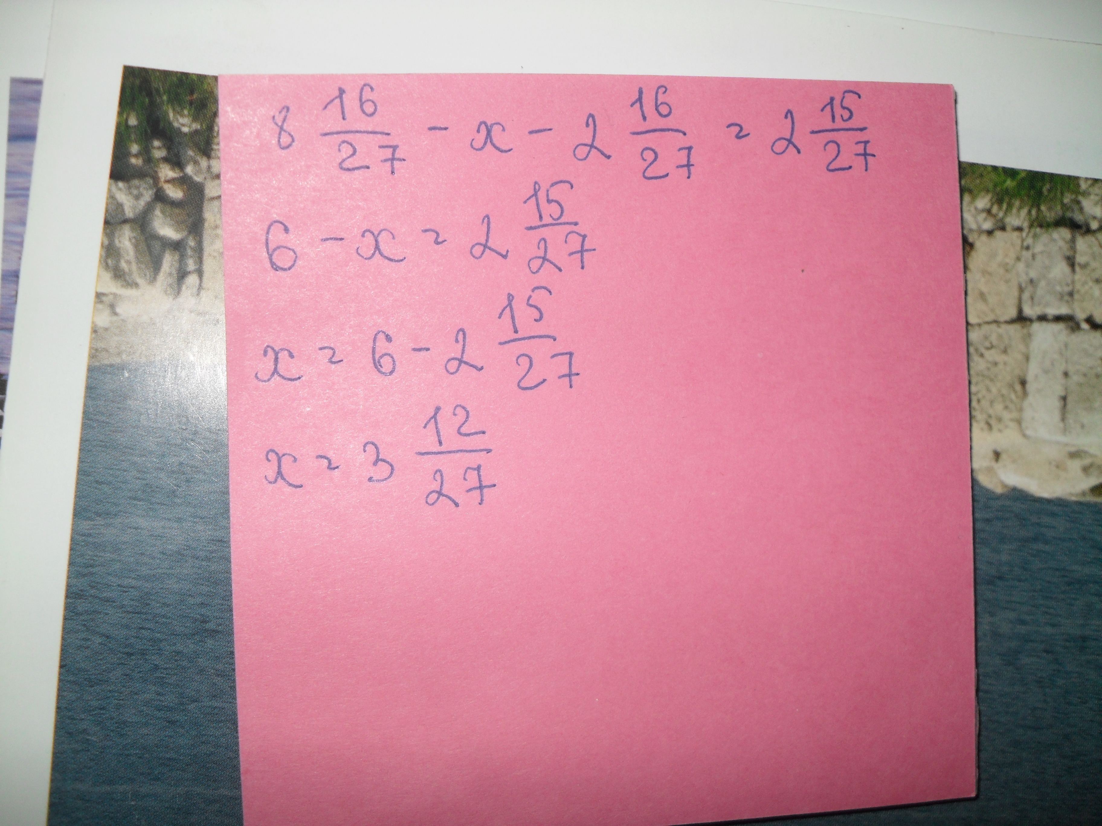 реши уравнение: 8целых16/27-(×+2цел.16/27)=2цел.15/27 А)3цел.12/27 Б)2цел.25/27 В)5/27 Г)1цел.15/27