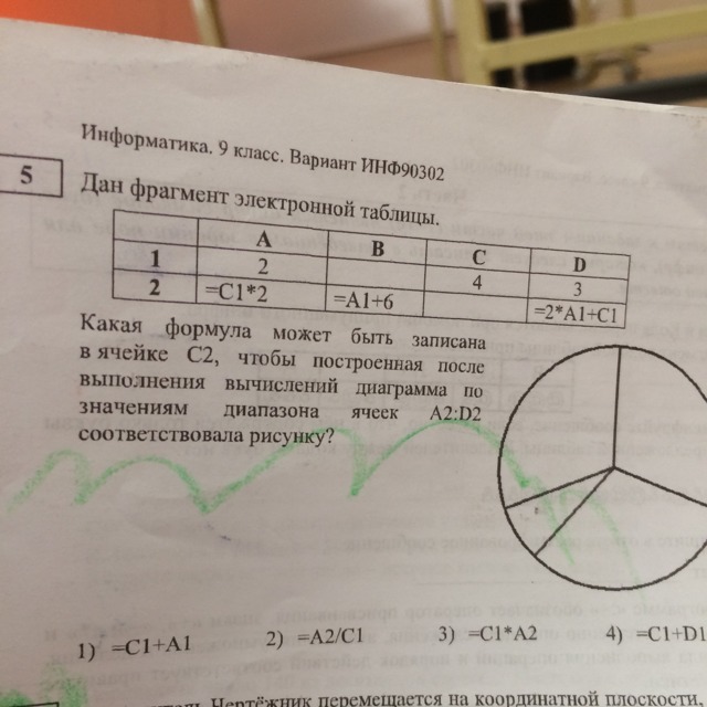 Какая формула может быть записана в ячейке с2 чтобы построенная после выполнений вычислений диаграмма по значениям диапозна ячеек A2:D2 соответствует рисунку