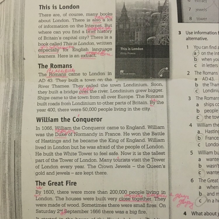 II.1.When did Romans come to England ? 2.Where did Romans build town ? 3. what did Romans build from Londinium to other parts of Britain.? III. 1. when did William the Conqueror come to England ? 2. Did he win the Battle of Hastings ? 3. Where did he live ? 4. why did he build the White Tower .?5. who built the White Tower? IV.1. From what made houses?2.How many people lived in town ?