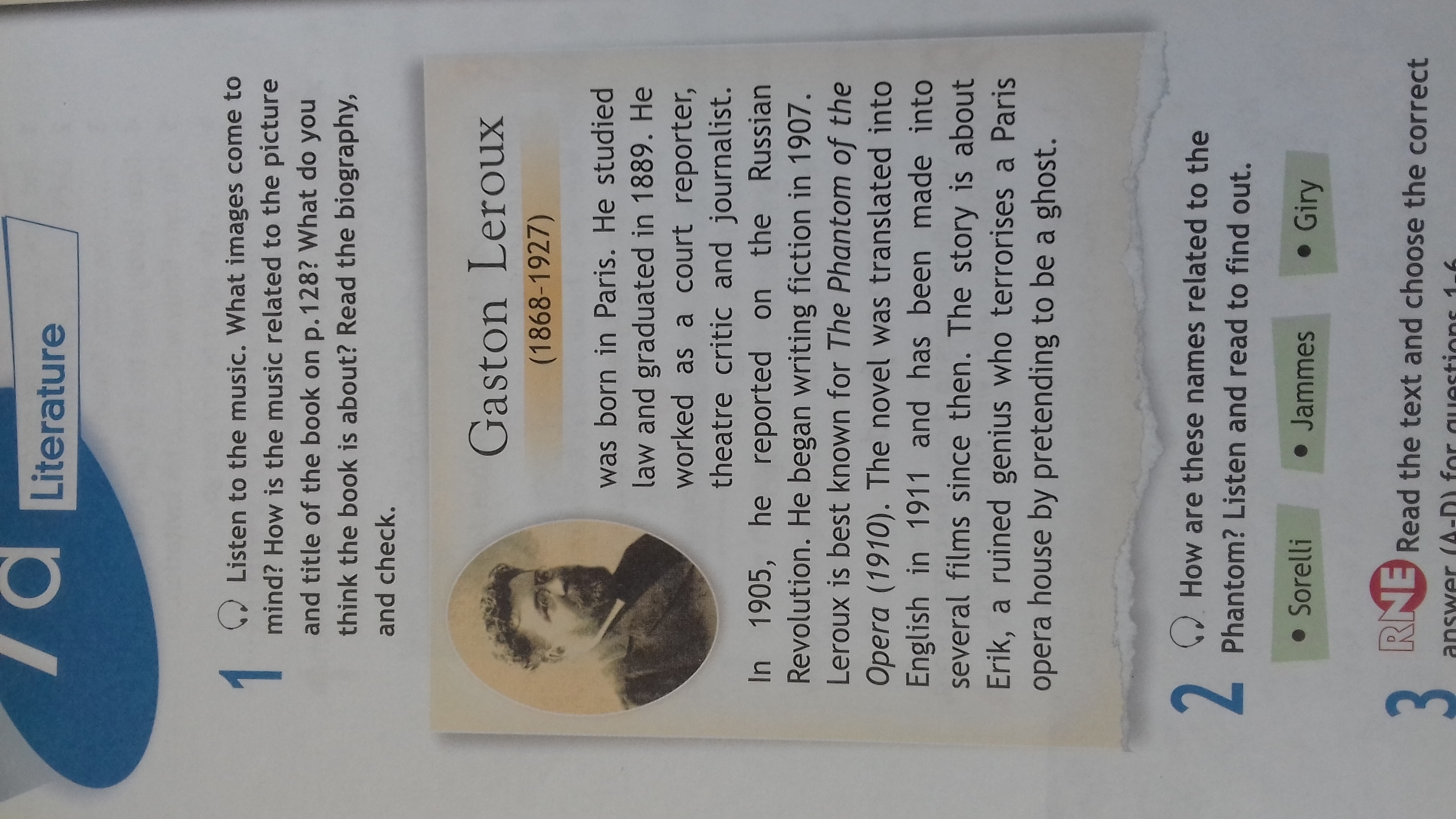 Gaston Lerox was born in Paris in 1868.He studied law and worked as a court reporter, theater critic and journalist. He began writing fiction in 1907 .His best known work is "The Phantom of the Opera " which was written in 1910.Several films were made on this novel.