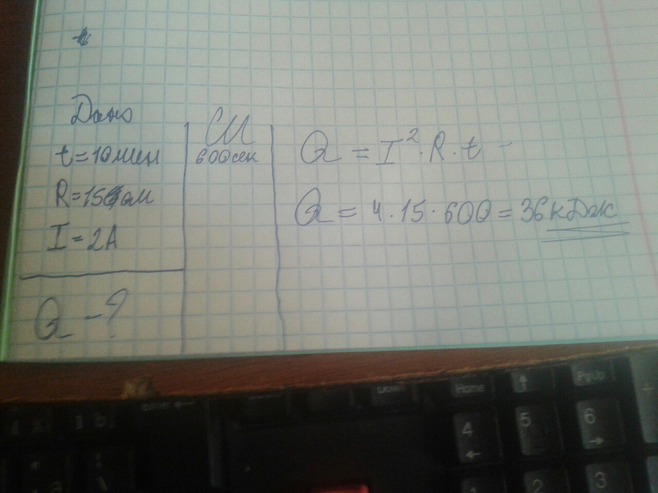 Какое количество теплоты выделит проводник сопротивлением 150м за 10мин если сила тока в цепи 2а?