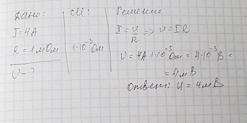Определить напряжение на клеммах амперметра,через который проходит ток силой I=4,0 A, если сопротивление амперметра R=1,0 мОм