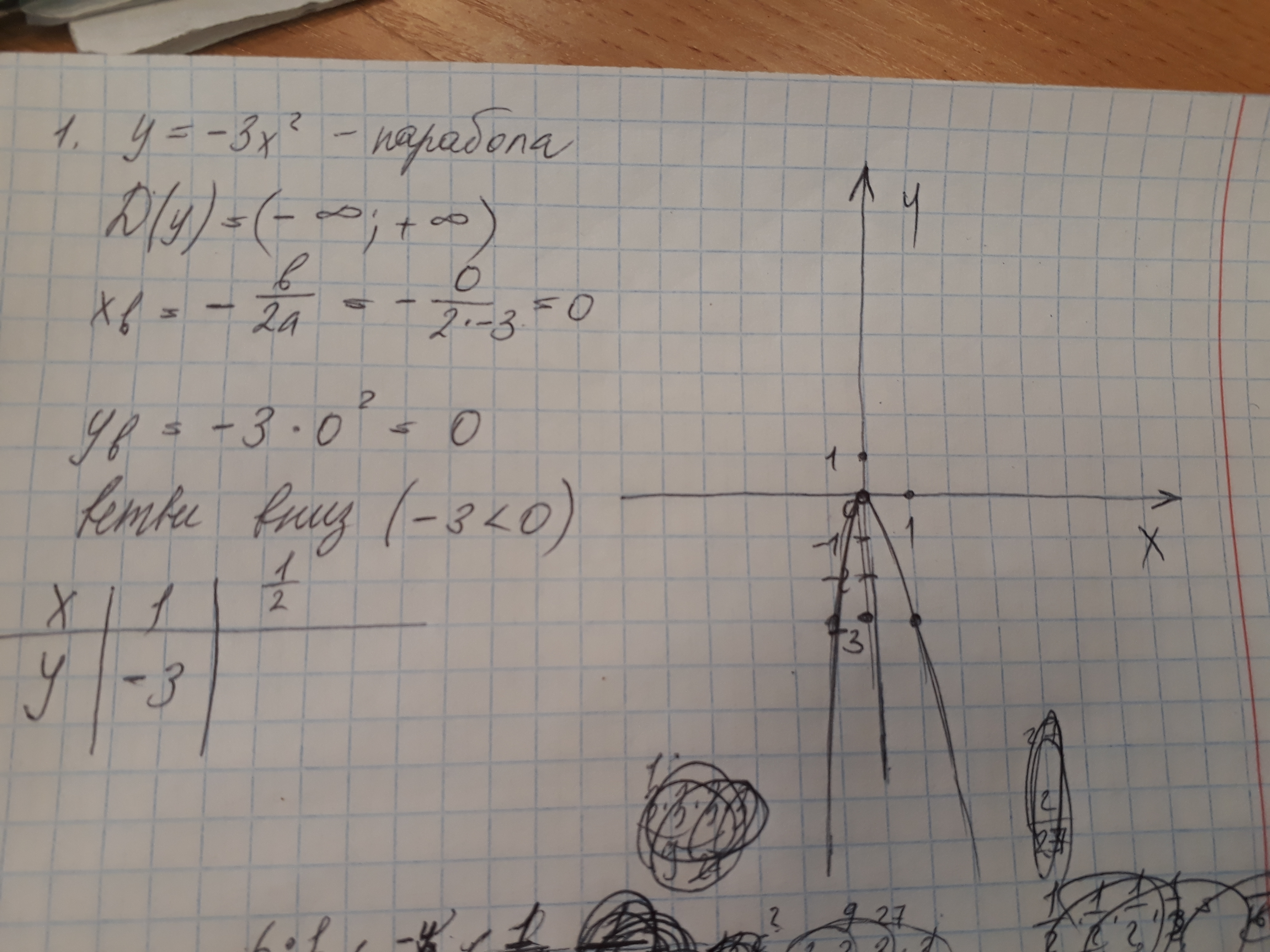 Далее находим координату х вершины по формуле(на фото есть), затем через х находим у. Определяем по знаку 1 коэффициента направление ветвей, -3<0, сл-но, ветви вниз.