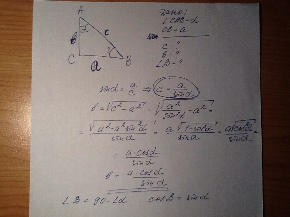 а) Выразите другой катет противолежащий ему угол и гипотенузу через А и альфа.