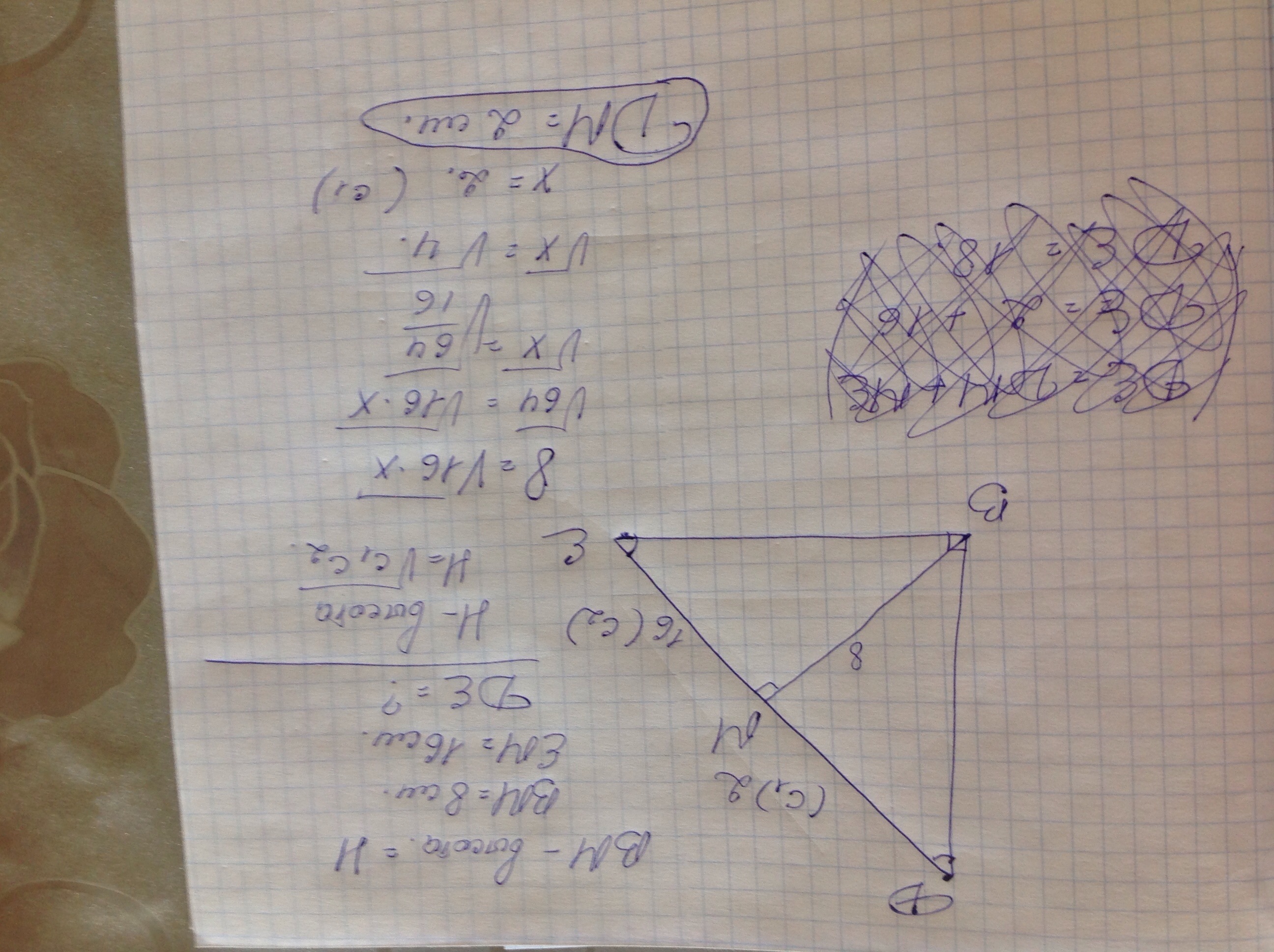 в прямоугольном треугольнике BDE на гипотенузе DE опущена высота BM. Найдите отрезок DM,если BM = 8 см, EM =16 см.