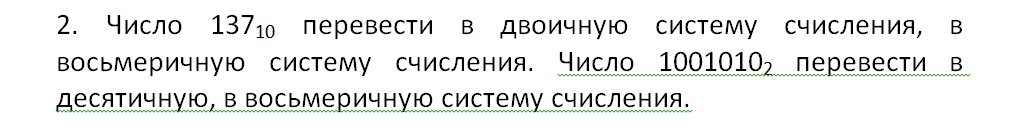 Число 137в10 перевести в двоичную систему счисления, в восьмеричную систему счисления. Число 1001010во2 перевести в десятичную, в восьмеричную систему счисления.
