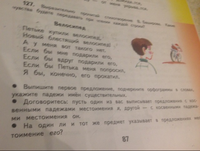 1) Петьке (Д.п.) купили велосипед (В.п.), новый блестящий велосипед (В.п.)!