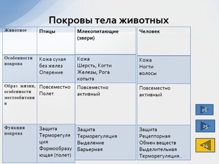 У птиц кожа тонкая, покрыта перьями, которые нужны для полета(делают форму тела обтекаемой). Покров пресмыкающихся в результате утолщения и ороговения образует чешуйки(щитки), слизистых желез нет, но есть пахучие. Различия в строении покровов связанны с средой обитания.
