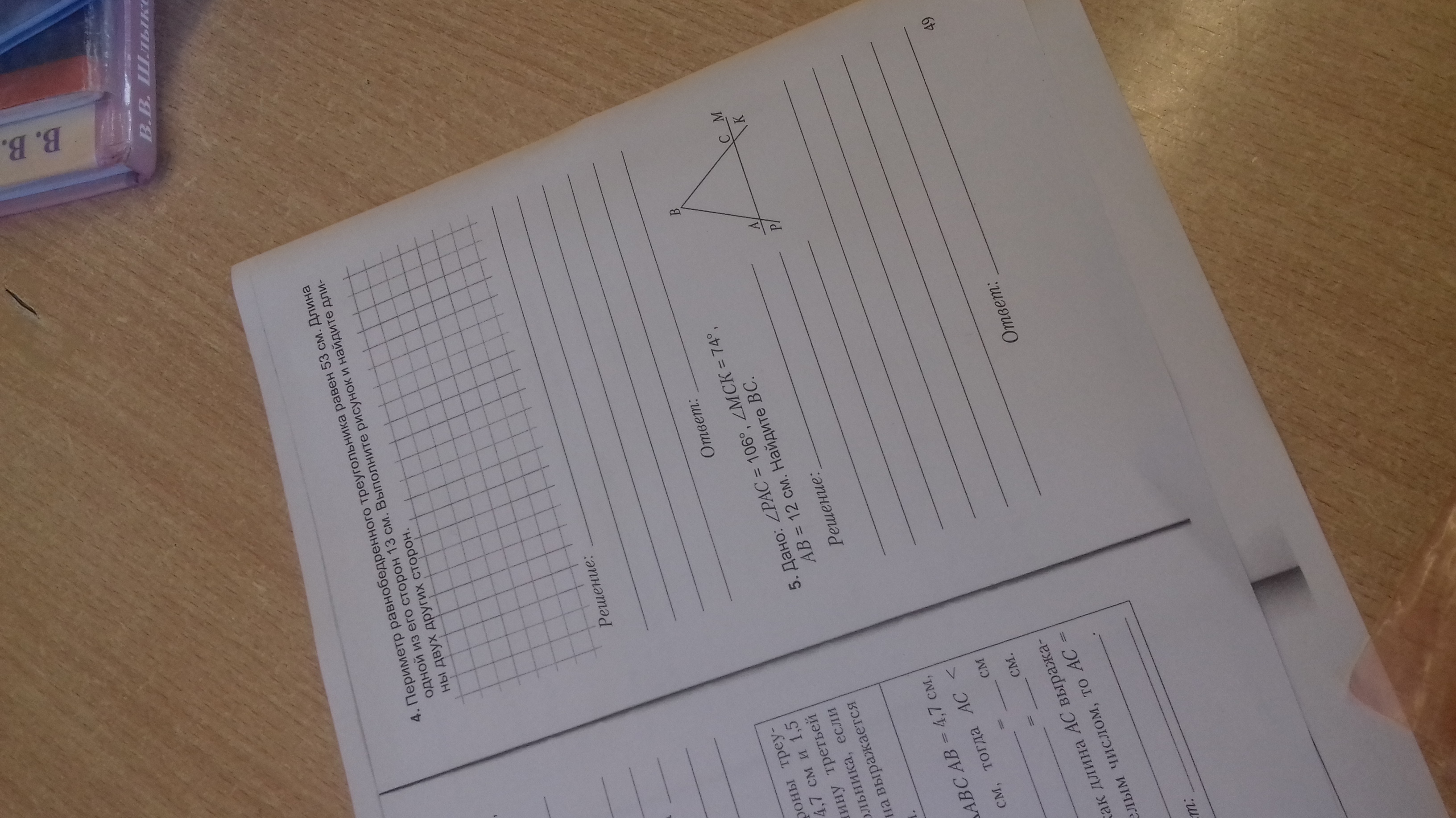 Дальше, угол РАС и ВАС - смежные, а как известно- сумма смежных углов равна 180 градусов, так как угол РАС - 106 градусов, значит угол ВАС = 180- РАС, то есть 180-106=74 градуса, так как угол ВАС и угол ВСА равны, значит треугольник равнобедренный, то есть сторона ВС равна 12см.