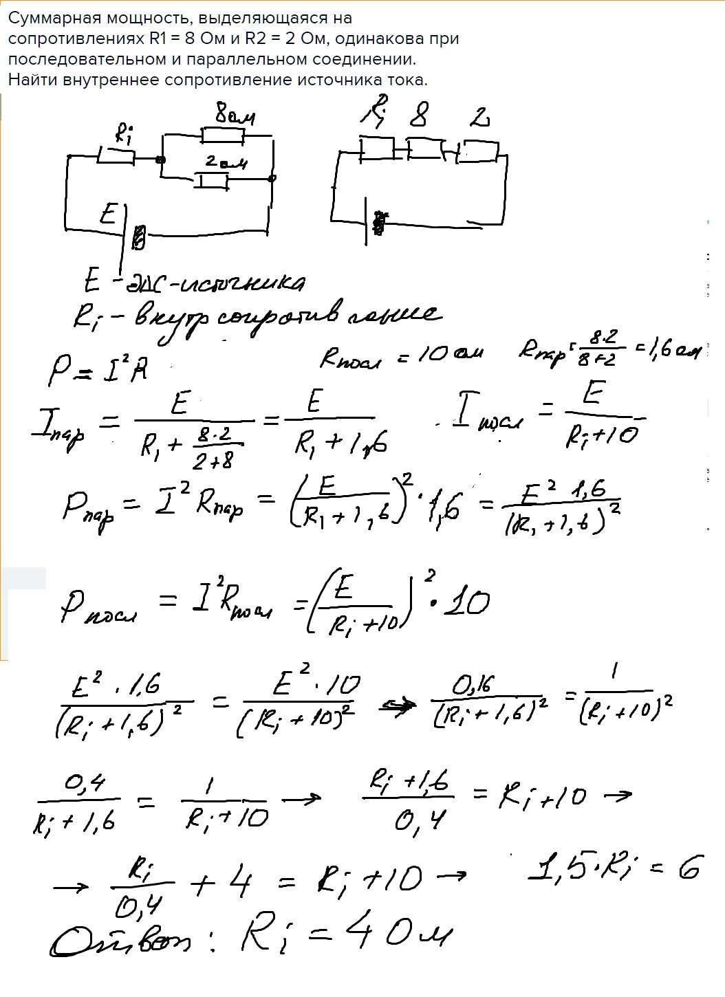 Суммарная мощность, выделяющаяся на сопротивлениях R1 = 8 Ом и R2 = 2 Ом, одинакова при последовательном и параллельном соединении. Найти внутреннее сопротивление источника тока.