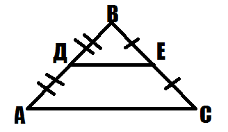1) Проведем прямую ДЕ, которая будет являться средней линией треугольника АВС, т.к. Д и Е - середины сторон.