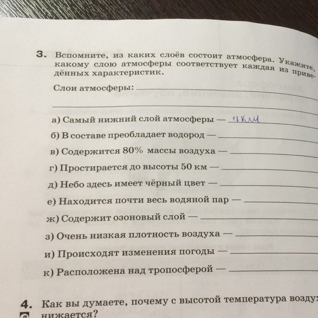 Вспомните из каких слоев состоит атмосфера. Укажите какому слое атмосферы соответственно каждая из приведённых характеристики