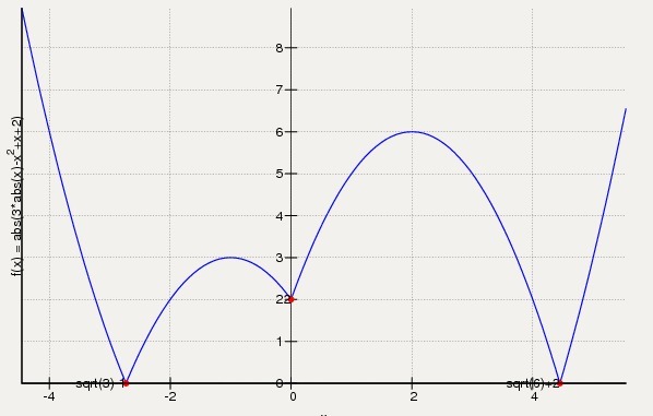 Корни - Х1= - 2,73 и Х2 = 0,73. Минимум при Х=- 1 значение У = - 3