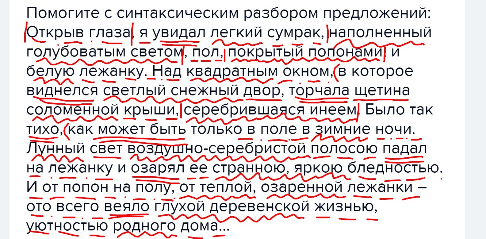 Помогите с синтаксическим разбором предложений: Открыв глаза, я увидал легкий сумрак, наполненный голубоватым светом, пол, покрытый попонами, и белую лежанку. Над квадратным окном, в которое виднелся светлый снежный двор, торчала щетина соломенной крыши, серебрившаяся инеем. Было так тихо, как может быть только в поле в зимние ночи. Лунный свет воздушно-серебристой полосою падал на лежанку и озарял ее странною, яркою бледностью. И от попон на полу, от теплой, озаренной лежанки – ото всего веяло глухой деревенской жизнью, уютностью родного дома…