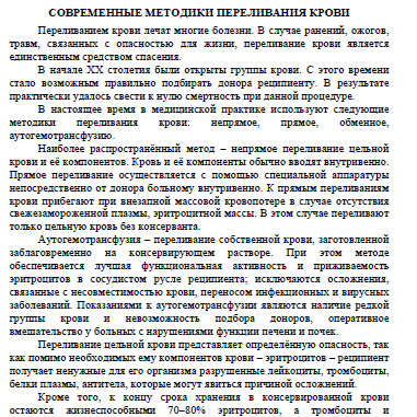2) Аутогемотрансфузионное преливание - это переливание собственной крови. Этот прием используют при наличии редкой группы крови, невозможности подбора донора, оперативное вмешательство у больных с нарушением функции печени и почек.