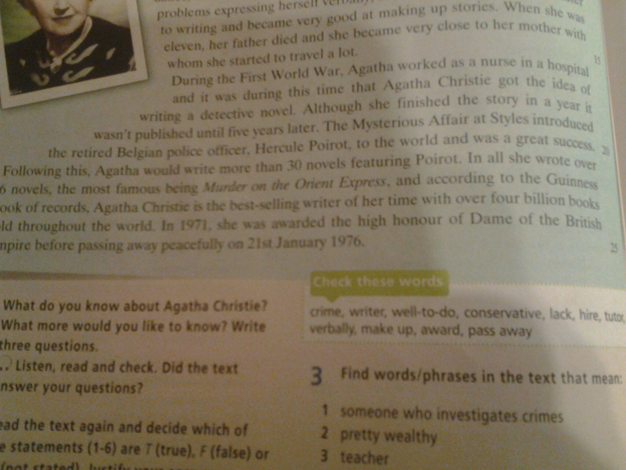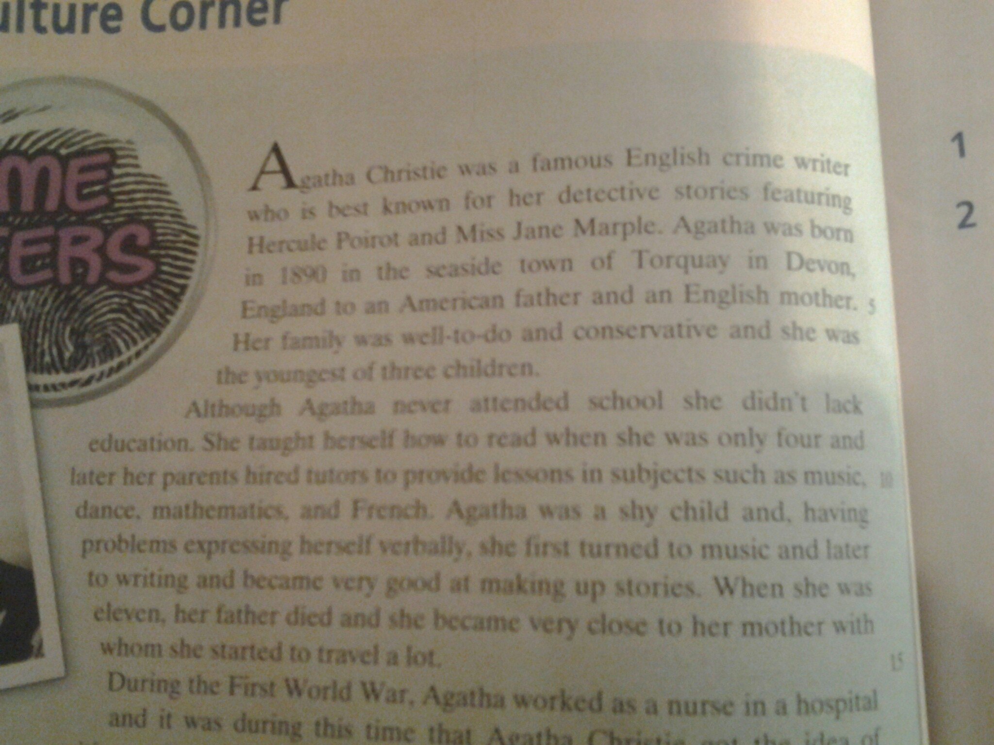 Агата Кристи была известной английской писательницей преступления которая была лучшая в её детективах Эркюль Пуаро и Мисс Джейн Марпл. Агата родилась в 1890 году в прибрежном городе Торквей (может и нет) в Девонии, отец англо-амереканец, а мать - англичанка. Её семья была очень состоятельная и консервативная и она была самая молодая из 3 детей.