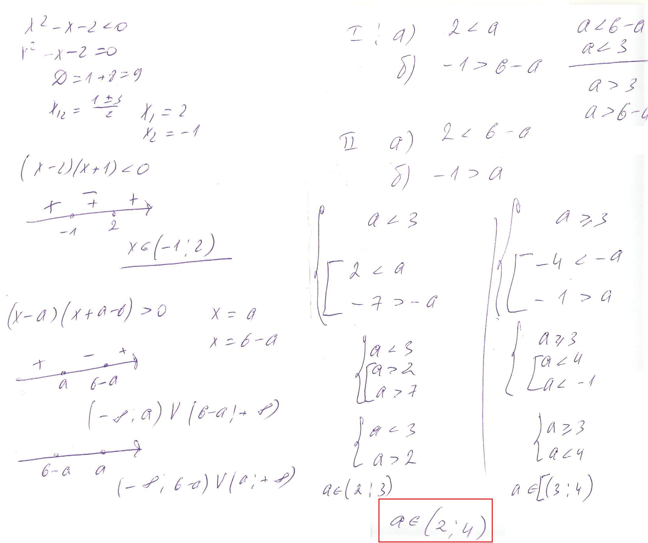 При каких параметрах каждое решение неравенства x^2-x-2<0 содержится среди решений неравенства (x-a)(x+a-6)>0