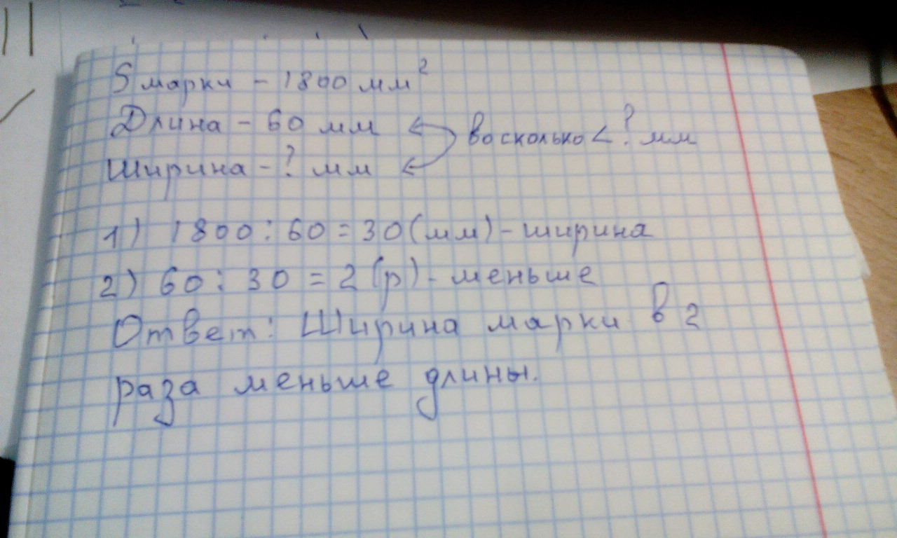 Площадь большой почтовой марки 1800мм2, а её длина 60мм.Во сколько раз ширина этой марки меньше длины?