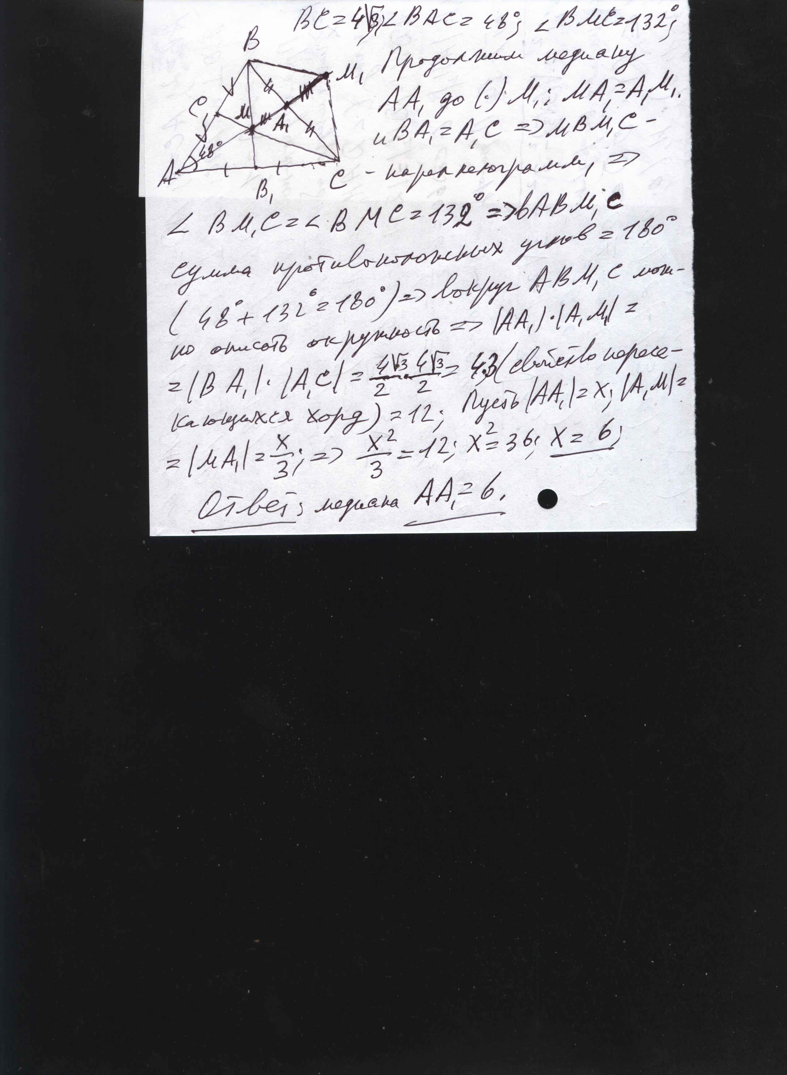 В треугольнике ABC медианы СС1 и ВВ1 пересекаются в точке М, угол ВАС=48 градусов, угол ВМС=132 градуса и ВС= 4 корней из 3. Найти третью медиану. С подробным решением пожалуйста.