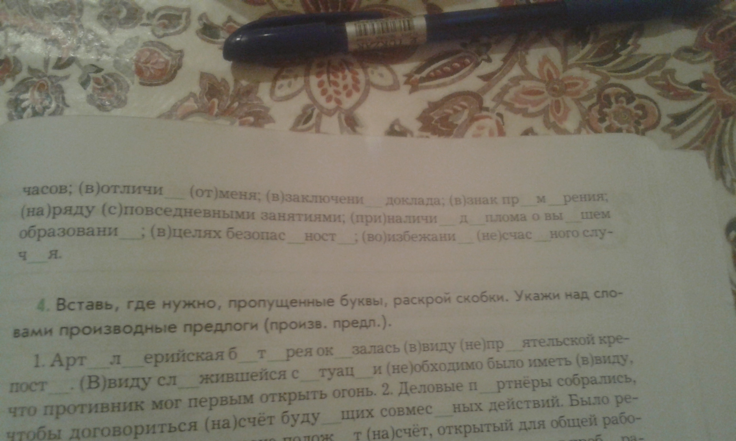 Из-за туч; из под крыш; над рекой; ввиду сложившихся обстоятельств; вокруг стадиона; вблизи деревни; вдоль дороги; животное вроде осла; вместо справочника; вследствие судебной ошибки; наподобие бабочки; насчёт продажи картины; поверх чёрного платья; напротив очаровательной гостьи; наперекор общественному мнению; идти навстречу опасностям; несмотря на ужасную непогоду; отправиться в путь; достичь цели, невзирая на препятствия; посередине площади; посреди улицы; позади вставшего на дыбы коня; всвязи с началом весны; в течение длительного времени; в продолжении нескольких лет прибывать за границей в качестве дипломата; на протяжении трёх