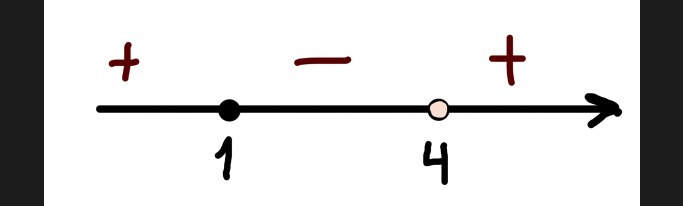 Но точку 4 необходимо выколоть, тк при х=4 знаменатель равен нулю, а х=1 входит в множество решений неравенства тк неравенство не строгое.