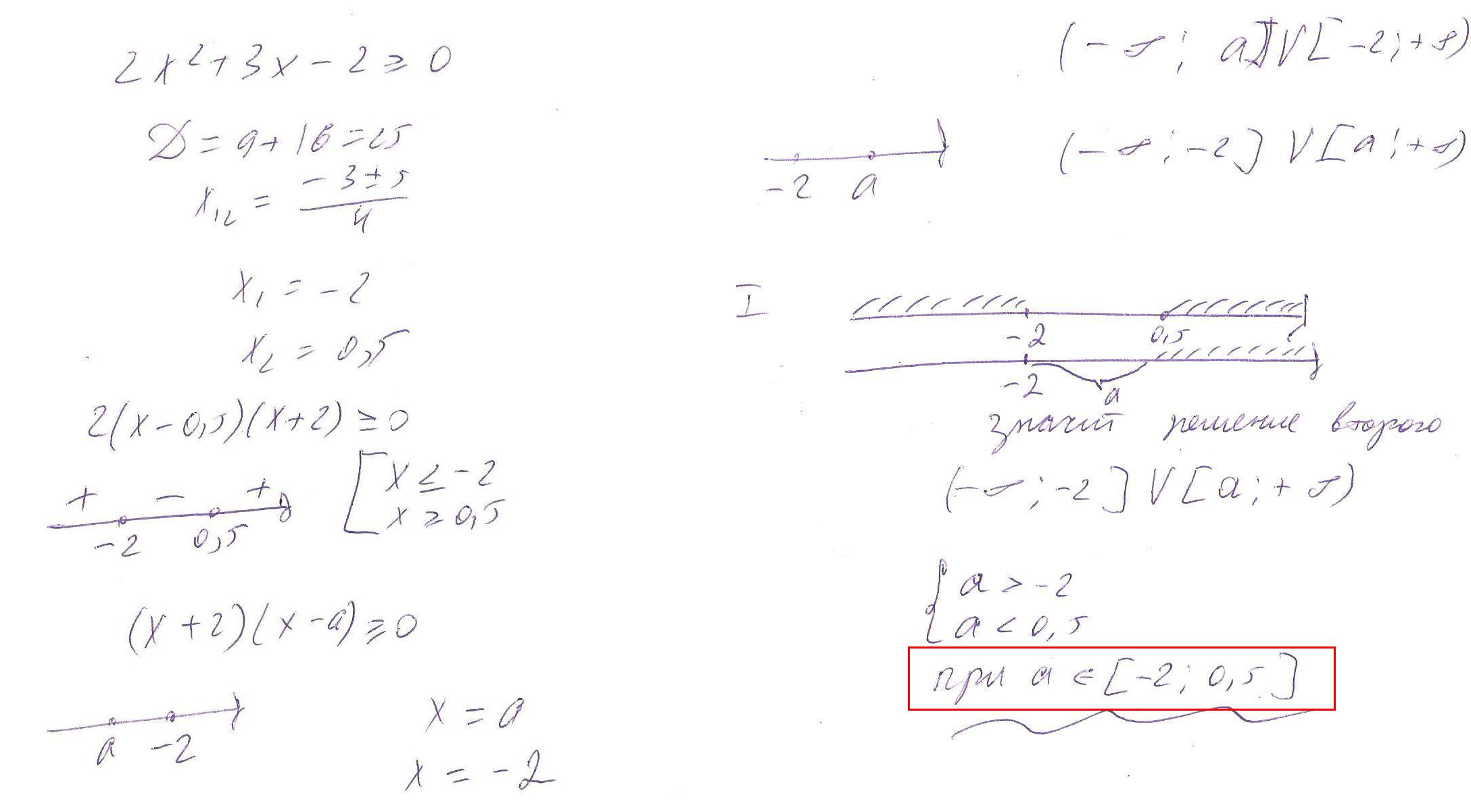 при каких значениях параметра неравенства 2x^2+3x-2>=0 содержится среди решений неравенства (х+2)(х-а)>=0