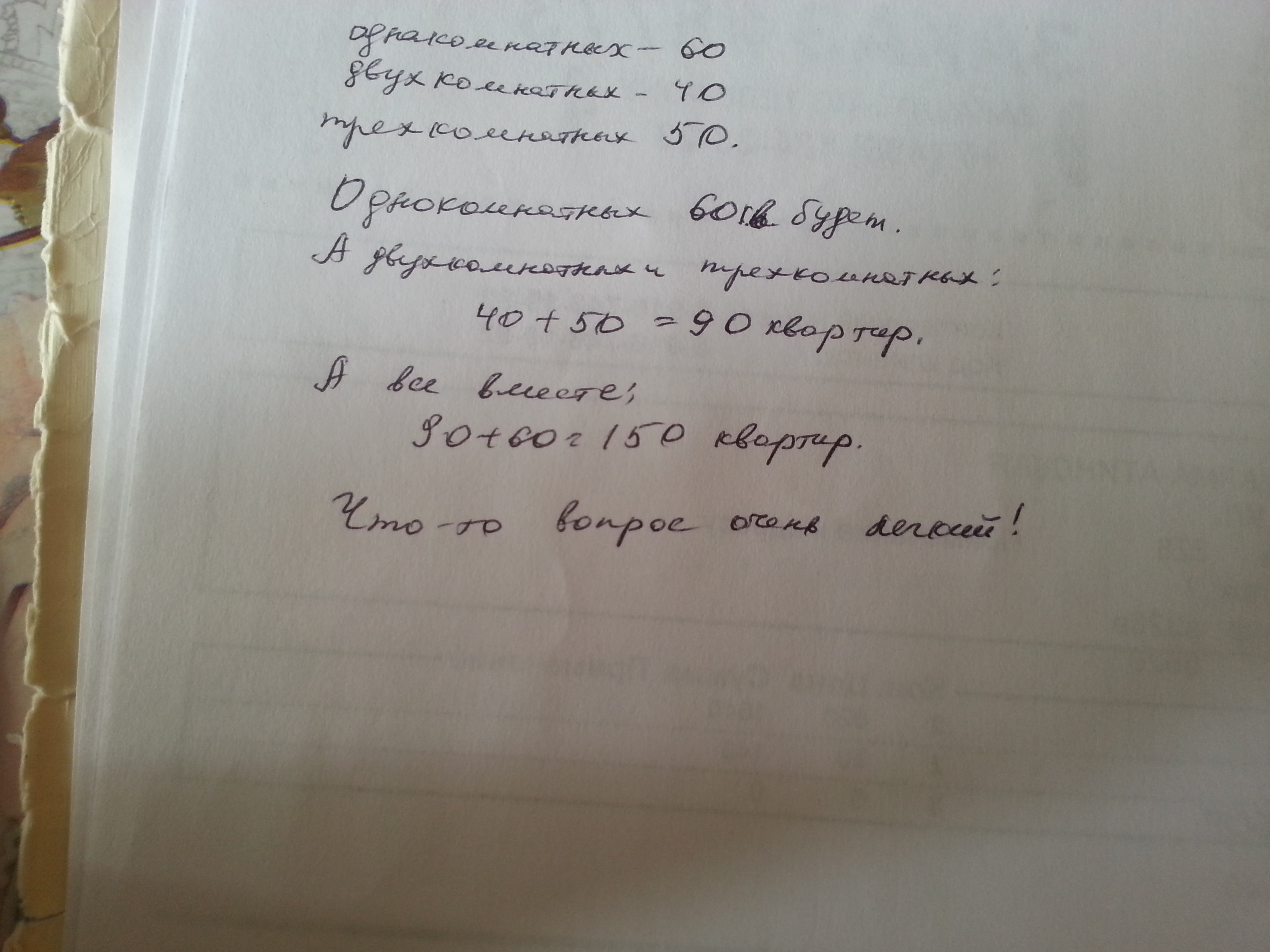по диаграмме однокомнатных 60, двухкомнатных 40, трехкомнатных 50.