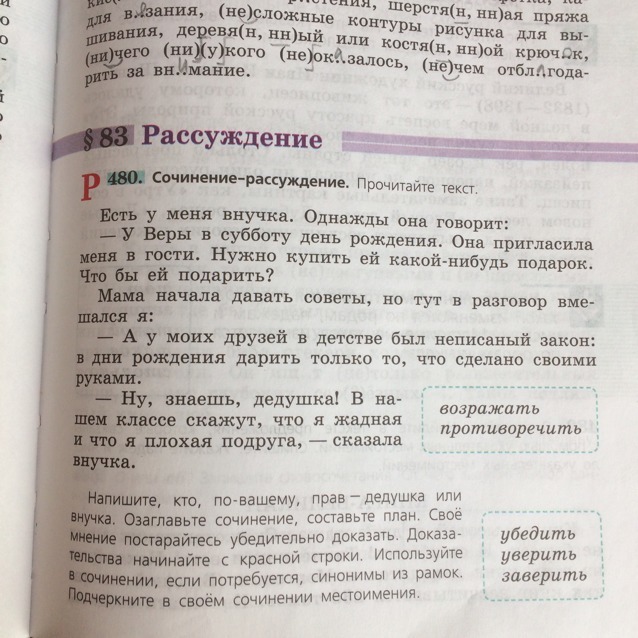 На самом деле подарок можно сделать и своими руками, и купить. Дедушка предложил сделать самостоятельно,что очень даже интересно. Но его внучка отвергла это предложение, потому что, как ей кажется, за это ее будут считать жадной девочкой. Внучка не права! Делать собственноручно какой либо подарок-не признак жадности, это, наоборот, показывает внимание по отношению к какому-либо человеку!