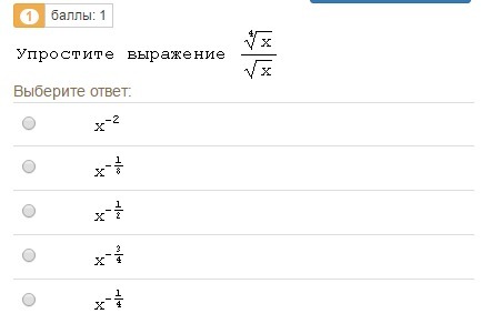 х^(1/4)/x^(1/2)=x^(1/4)*x^(-1/2)=x^(1/4-1/2)=x^(-1/4)