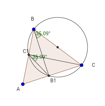 СС₁В₁ и СВВ₁ являются вписанными в эту окружность и опираются на одну и ту же дугу В₁С , следовательно они равны. Доказано