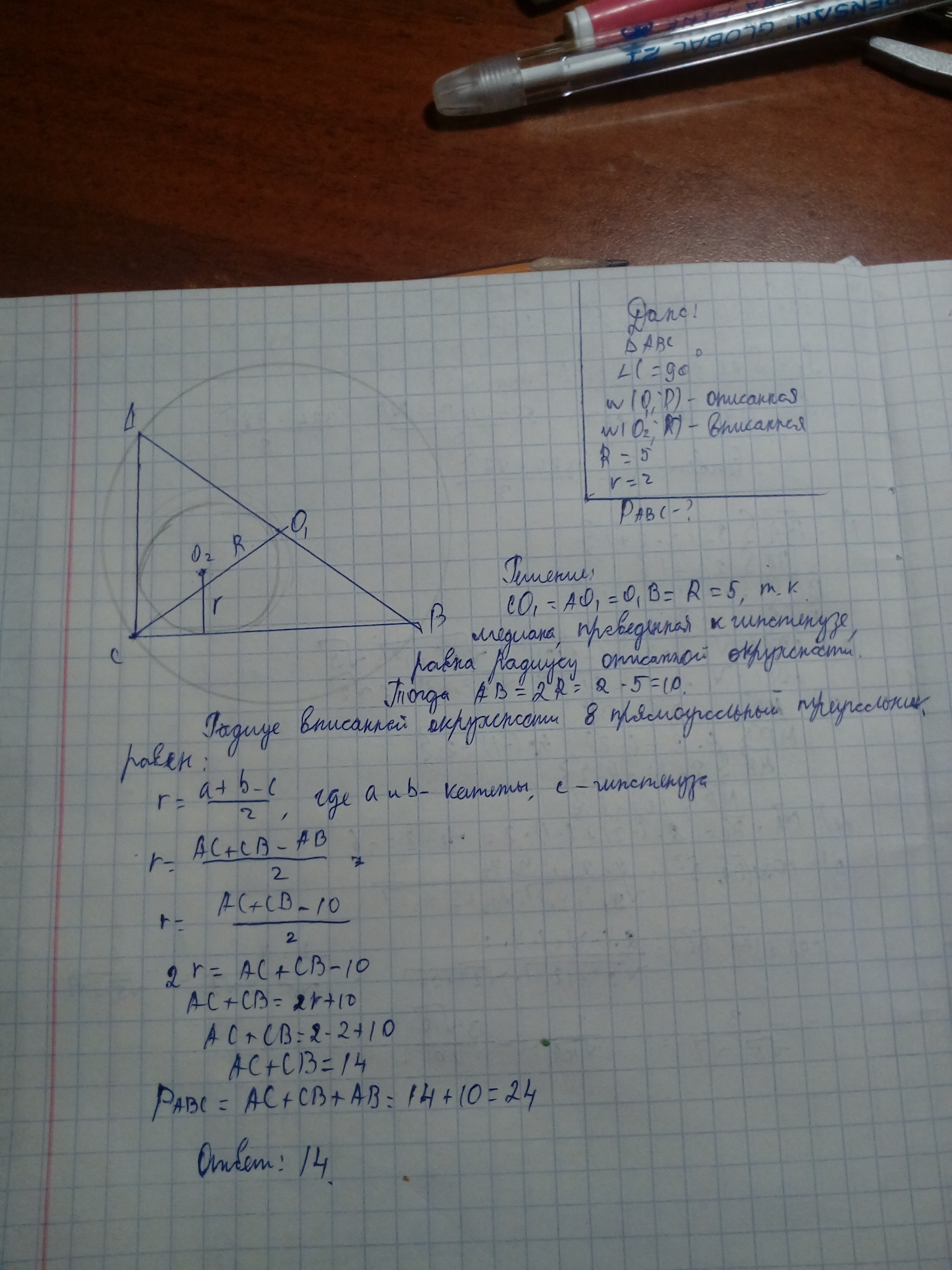 Радиусы окружности, вписанной в прямоугольный треугольник и окружности, описанной около него, равны 2 и 5. Найдите периметр треугольника
