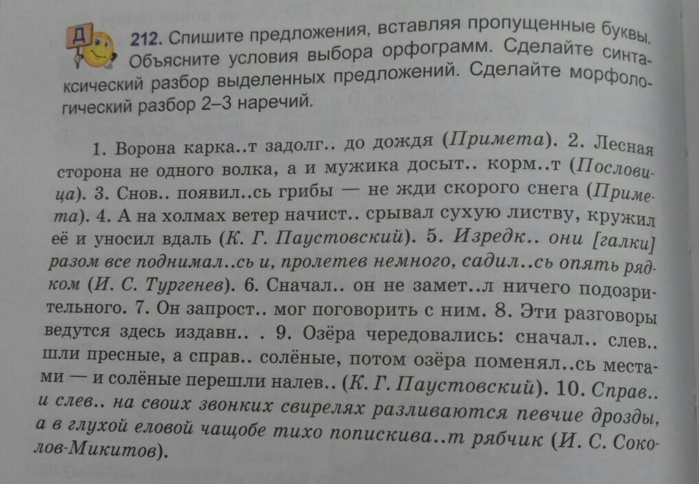 1.Ворона каркает задолго до дождя.2.Лесная сторона не одного волка, а и мужика досыта кормит.3. Снова появились грибы-не жди скорого снега.4. А на холмах ветер начисто срывал сухую листву,кружил её и уносил вдаль.5.Изредка они [галки] разом все поднимались и, пролетев немного,садились опять рядком.6.Сначала он не заметил ничего подозрительного.7.Он запросто мог поговорить с ним.8.Эти разговоры ведутся здесь издавна. 9. Озёра чередовались: сначала слева шли прекрасные, а справа солёные, потом озёра поменялись местами-и солёные перешли налево.10.Справа и слева на своих звонких свирелях разливаются певчие дрозды, а в глухой еловой чащобе тихо попискивает рябчик.