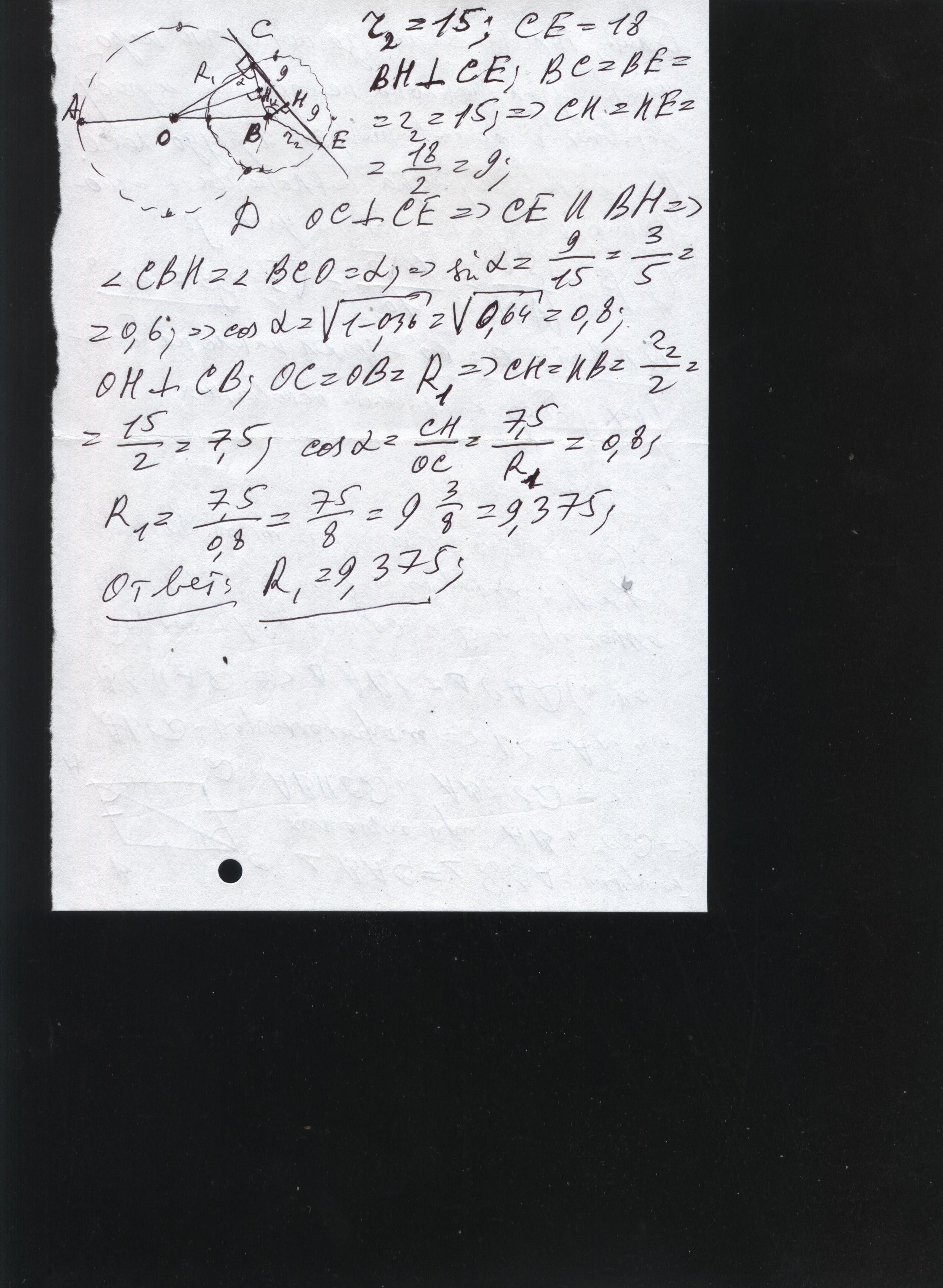 Две окружности пересекаются в точках C и D. Точка B — центр второй окружности, а отрезок AB — диаметр первой. Из точки C провели касательную к первой окружности, которая пересекает вторую окружность в точке E, отличной от C. Найдите радиус первой окружности, если радиус второй равен 15, а длина отрезка CE равна 18.