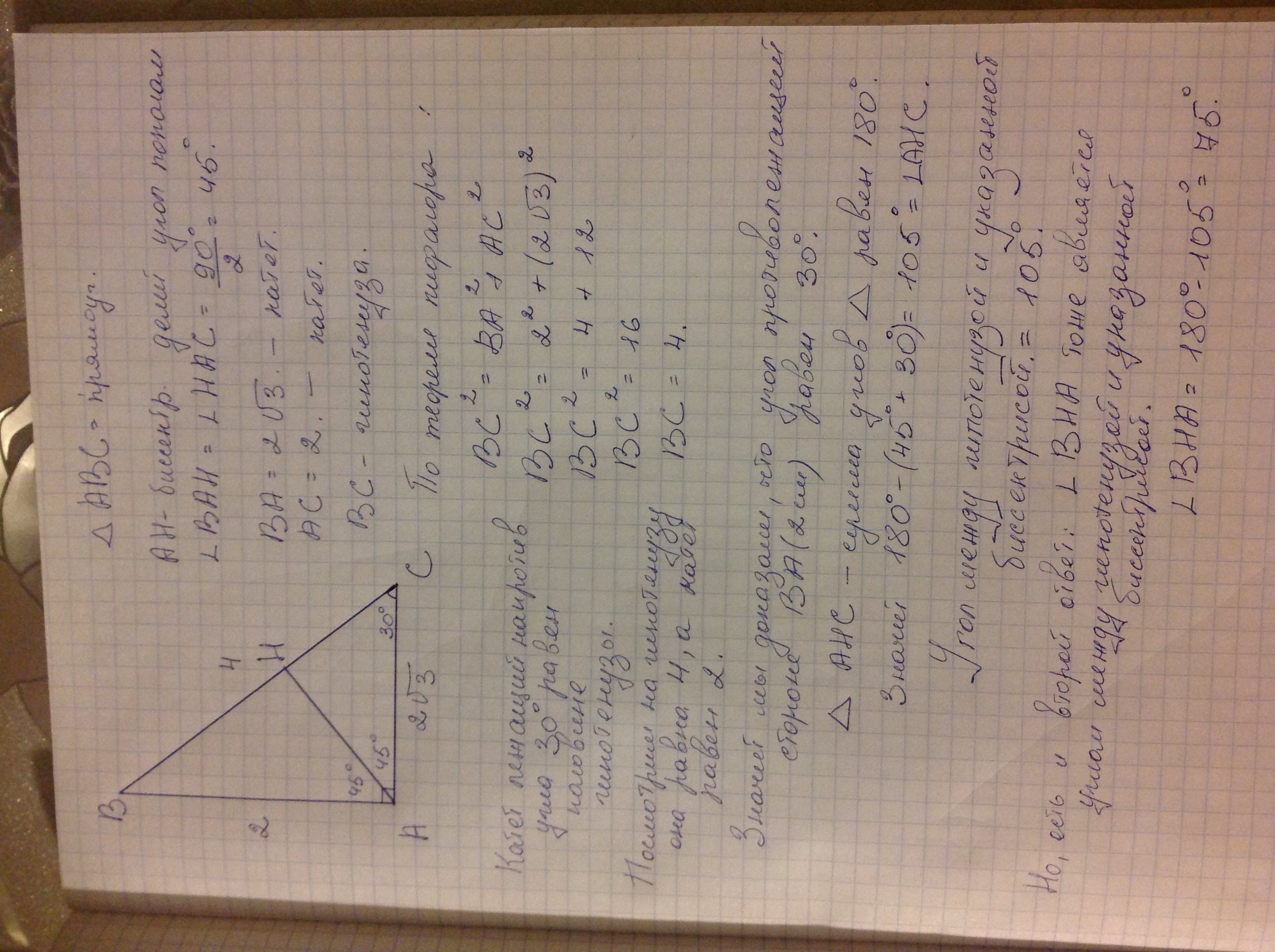 В прямоугольном треугольнике с катетами 2 и 2√3 см проведена биссектриса из прямого угла. Найдите угол между гипотенузой и указанной биссектрисой.