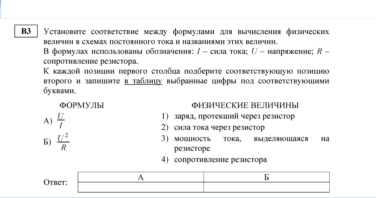 Установите соответствие между формулами для вычисления физических величин в схемах постоянного тока и названиями этих величин. В формулах использованы обозначения: I - сила тока, U - напряжение, R - сопротивление резистора. К каждой позиции первого столбца подберите соответствующую позицию второго: А) U/I Б) U в квадрате/R 1) заряд, протекший через резистор 2) сила тока через резистор 3) мощность тока, выделяющаяся на резисторе 4)сопротивление резистора